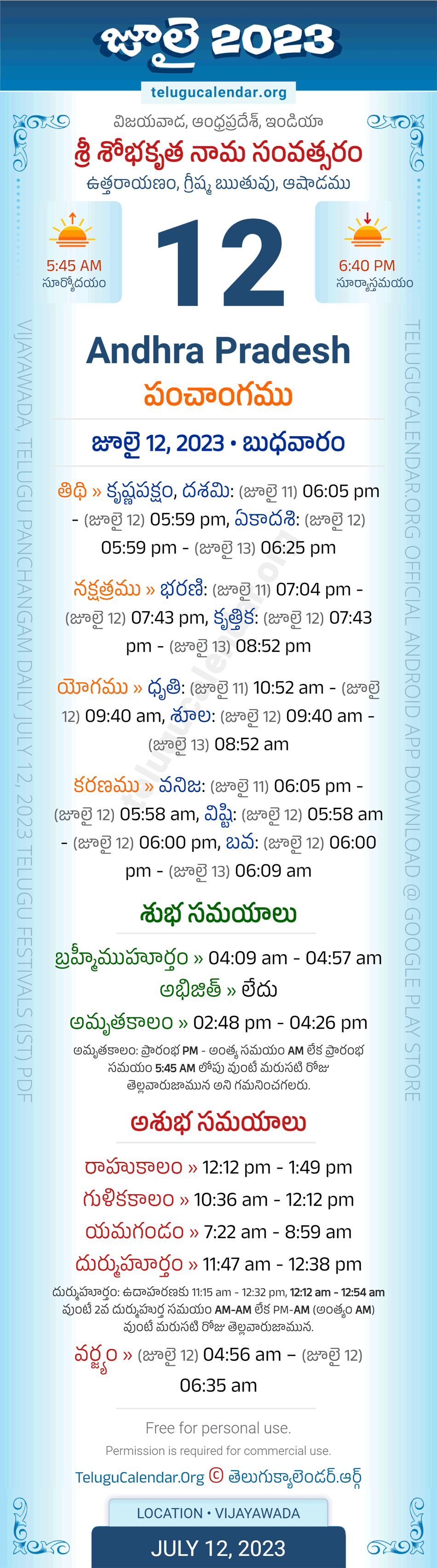 Download » July 12, 2023 » Andhra Pradesh (Vijayawada) Telugu Panchangam Daily Sheet with Auspicious and Inauspicious Timings.