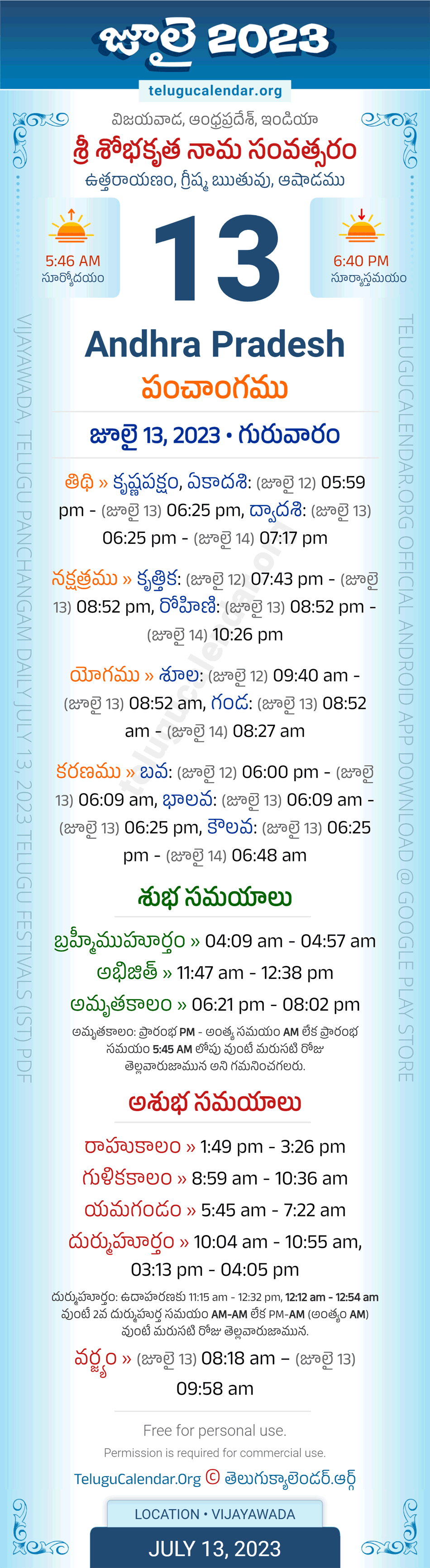 Download » July 13, 2023 » Andhra Pradesh (Vijayawada) Telugu Panchangam Daily Sheet with Auspicious and Inauspicious Timings.
