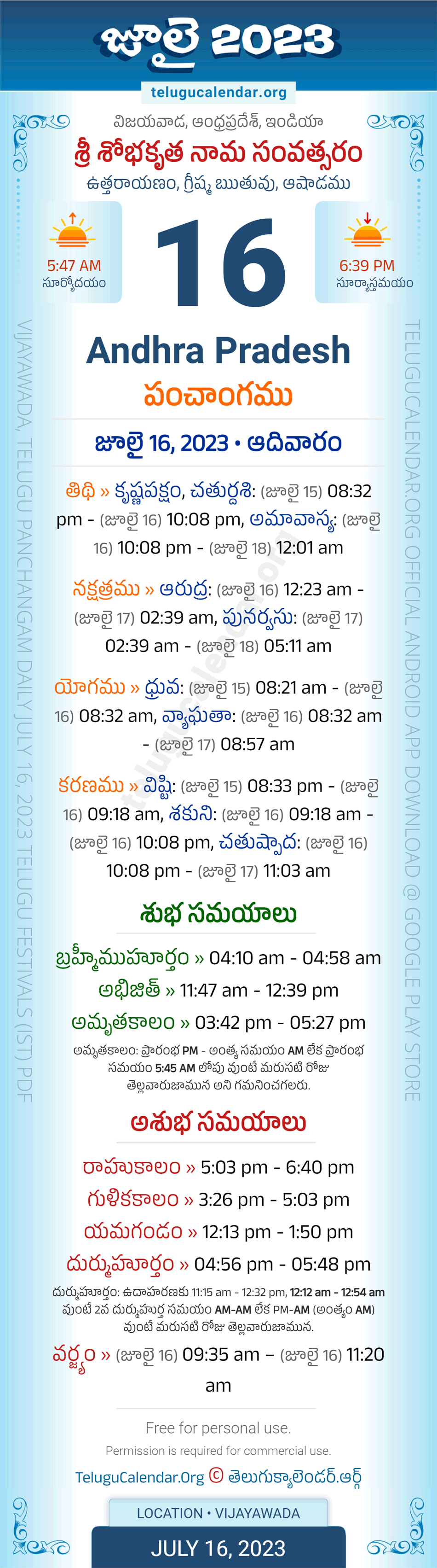 Download » July 16, 2023 » Andhra Pradesh (Vijayawada) Telugu Panchangam Daily Sheet with Auspicious and Inauspicious Timings.