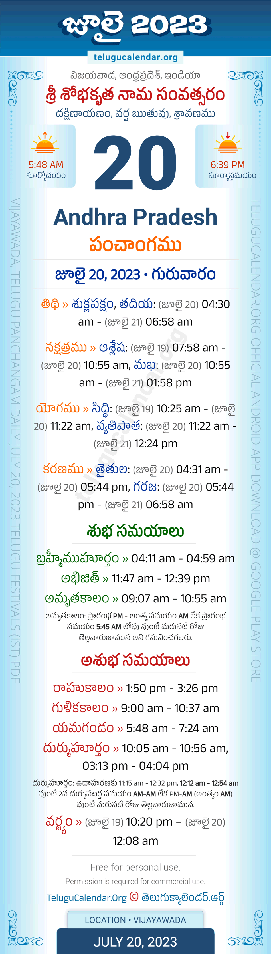 Download » July 20, 2023 » Andhra Pradesh (Vijayawada) Telugu Panchangam Daily Sheet with Auspicious and Inauspicious Timings.
