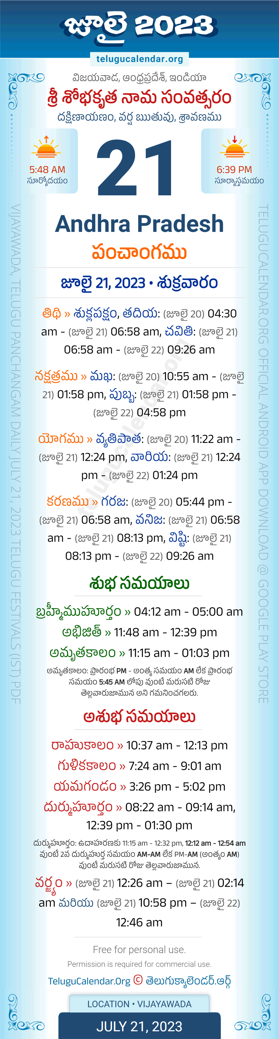 Download » July 21, 2023 » Andhra Pradesh (Vijayawada) Telugu Panchangam Daily Sheet with Auspicious and Inauspicious Timings.