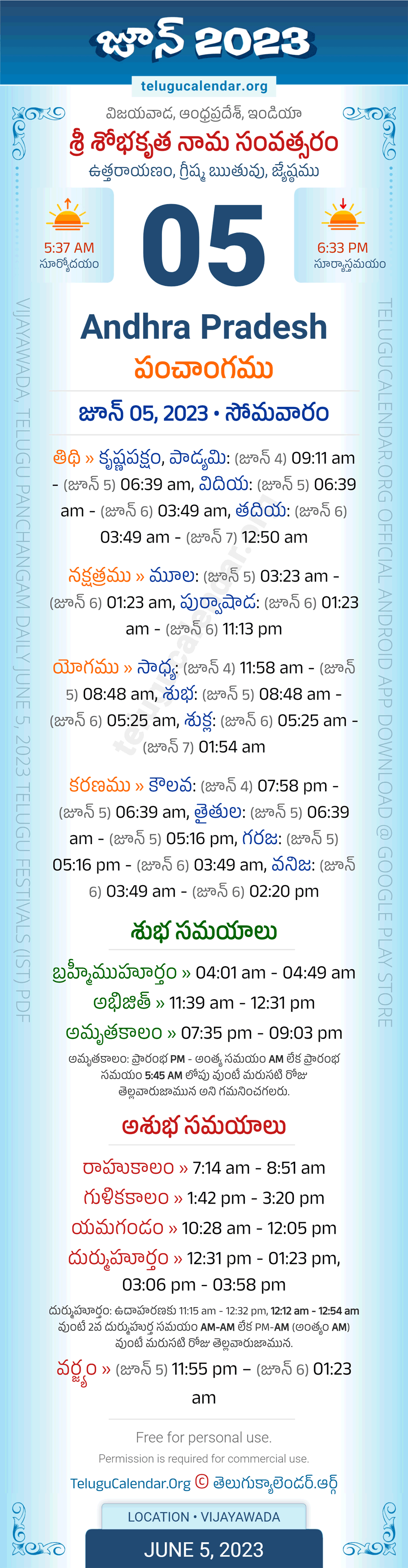 Download » June 5, 2023 » Andhra Pradesh (Vijayawada) Telugu Panchangam Daily Sheet with Auspicious and Inauspicious Timings.