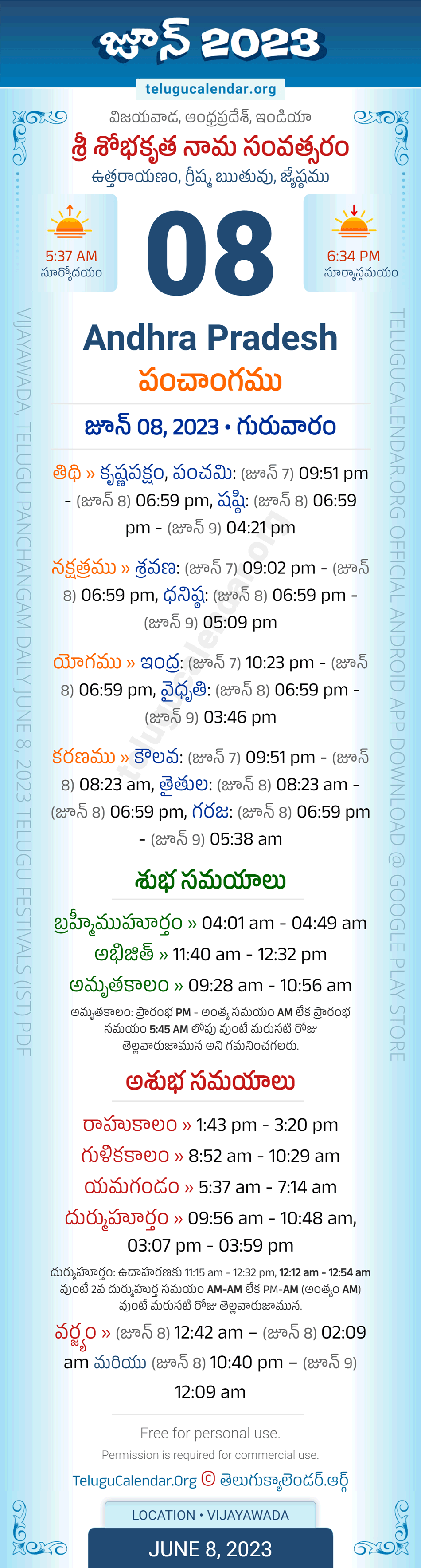 Download » June 8, 2023 » Andhra Pradesh (Vijayawada) Telugu Panchangam Daily Sheet with Auspicious and Inauspicious Timings.