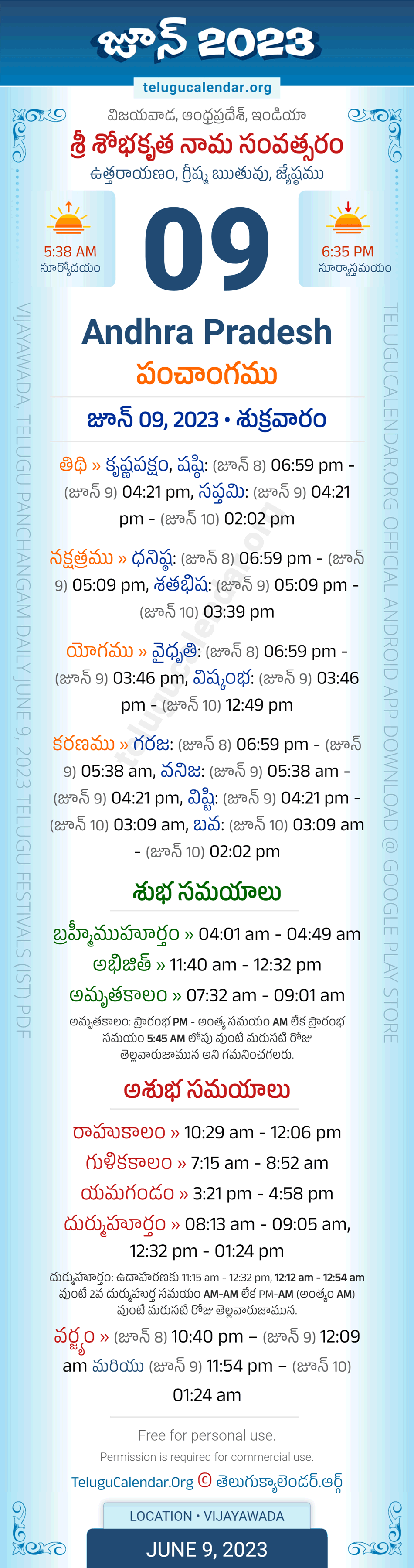 Download » June 9, 2023 » Andhra Pradesh (Vijayawada) Telugu Panchangam Daily Sheet with Auspicious and Inauspicious Timings.