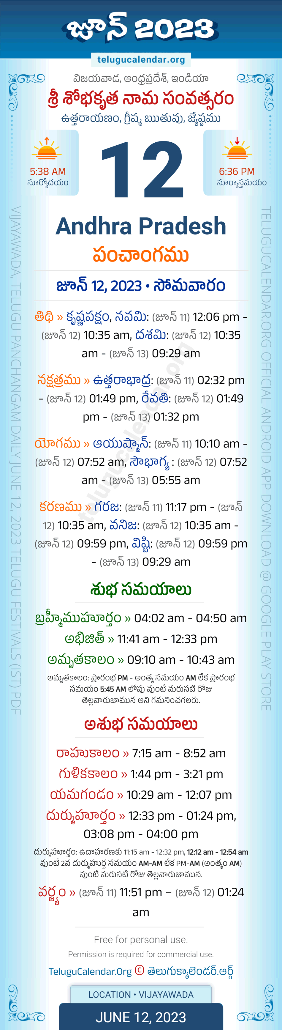 Download » June 12, 2023 » Andhra Pradesh (Vijayawada) Telugu Panchangam Daily Sheet with Auspicious and Inauspicious Timings.