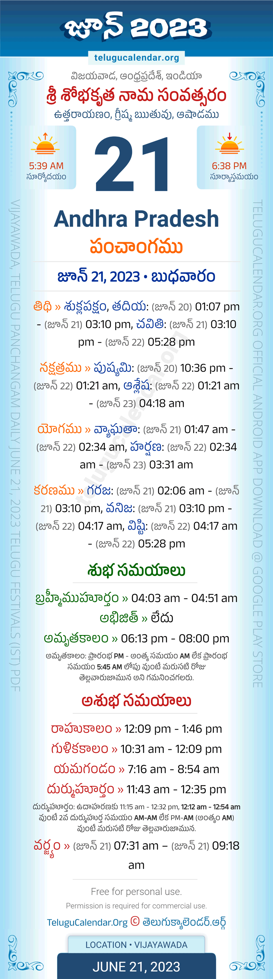 Apart from the Panchangam June 21, 2023 Andhra Pradesh Telugu Calendar Daily Sheet, you can also find the Sunrise and Sunset (Middle Limb) timings, Paksham, Telugu Year, Yanam, Rutuvu, Telugu Month. Today's Andhra Pradesh Auspicious Timings June 21, 2023 (Shubha Muhuratam Today Good Timings like Abhijit Muhurtham, Amruta Kalam & Brahma Muhurtham) and Today's Andhra Pradesh Inauspicious Timings June 21, 2023 (Bad Timings like Durmuhurtham, Rahukalam, Gulika kalam & Yamagandam) with starting and end timings in the above image.