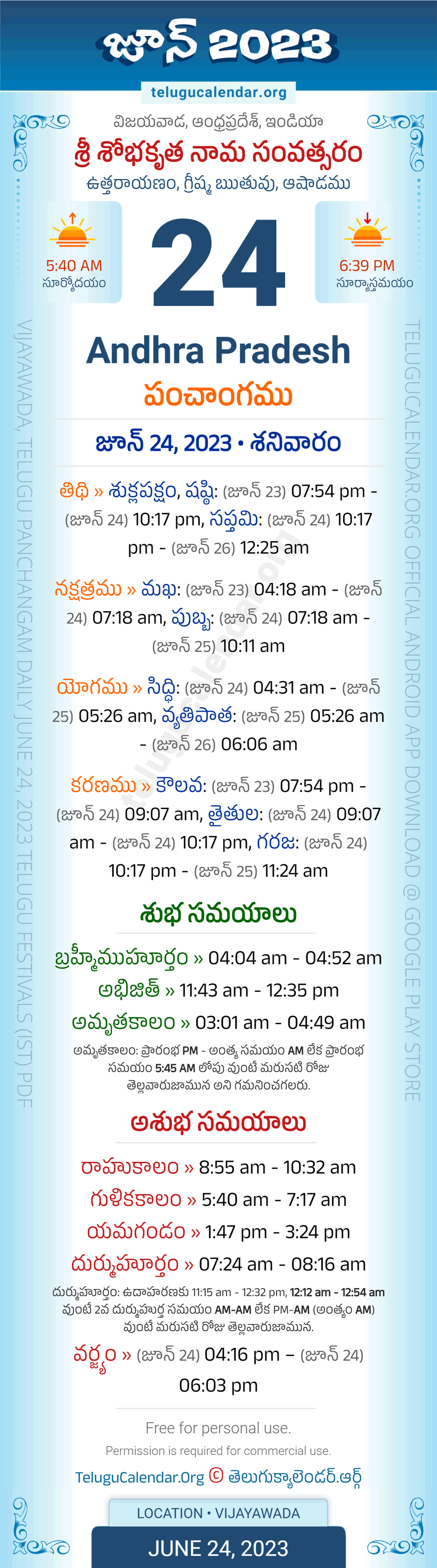Download » June 24, 2023 » Andhra Pradesh (Vijayawada) Telugu Panchangam Daily Sheet with Auspicious and Inauspicious Timings.