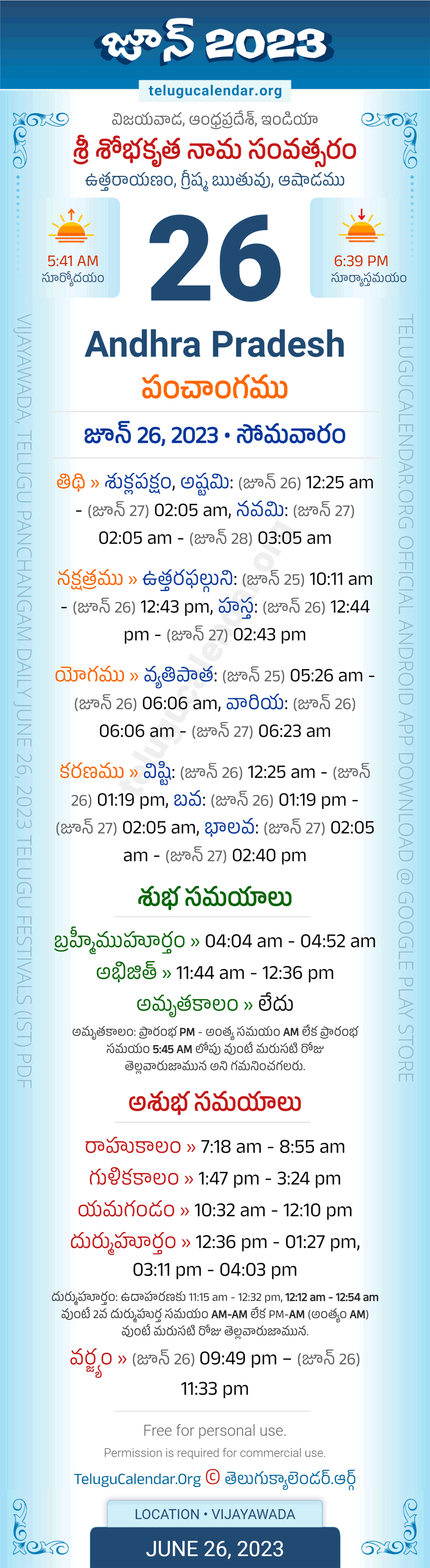 Download » June 26, 2023 » Andhra Pradesh (Vijayawada) Telugu Panchangam Daily Sheet with Auspicious and Inauspicious Timings.