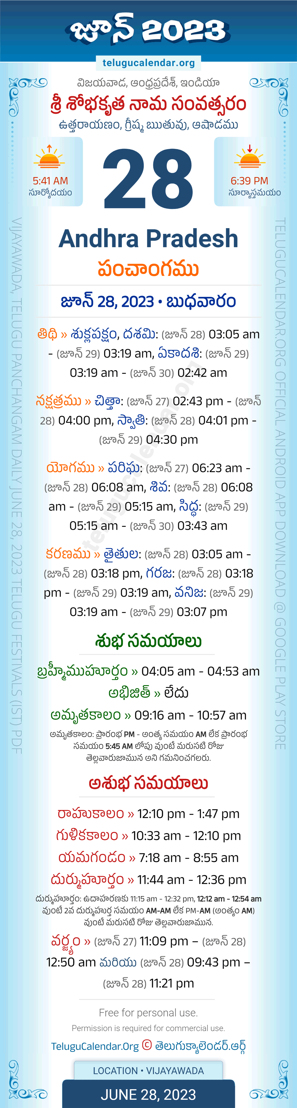 Download » June 28, 2023 » Andhra Pradesh (Vijayawada) Telugu Panchangam Daily Sheet with Auspicious and Inauspicious Timings.