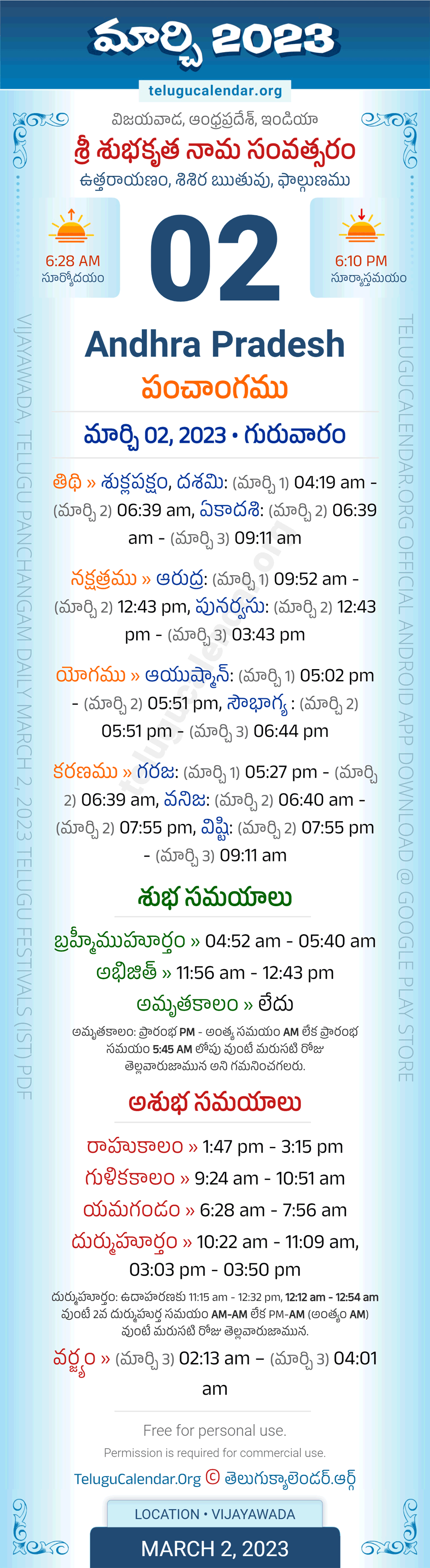 Andhra Pradesh Panchangam March 2, 2023 Daily Sheet in Telugu... Andhra Pradesh Telugu Panchangam Thursday, March 02, 2023, Today's Andhra Pradesh Tithi: Sukla Paksham, Dashami: (Mar 1) 04:19 am - (Mar 2) 06:39 am, Ekadashi: (Mar 2) 06:39 am - (Mar 3) 09:11 am, Today's Andhra Pradesh Nakshatram: Arudra: (Mar 1) 09:52 am - (Mar 2) 12:43 pm, Punarvasu: (Mar 2) 12:43 pm - (Mar 3) 03:43 pm, Telugu Year: Sri Subhakritu Nama Samvatsaram, Vedic Aayana: Uttarayanam, Vedic Rutuvu: Shishira, Chandramasa (Amanta): Phalgunamu. Below image showing information about the 5 attributes of the day, viz., Varam, Tithi, Nakshatram, Yogam & Karanam along with starting and end timings. Read more