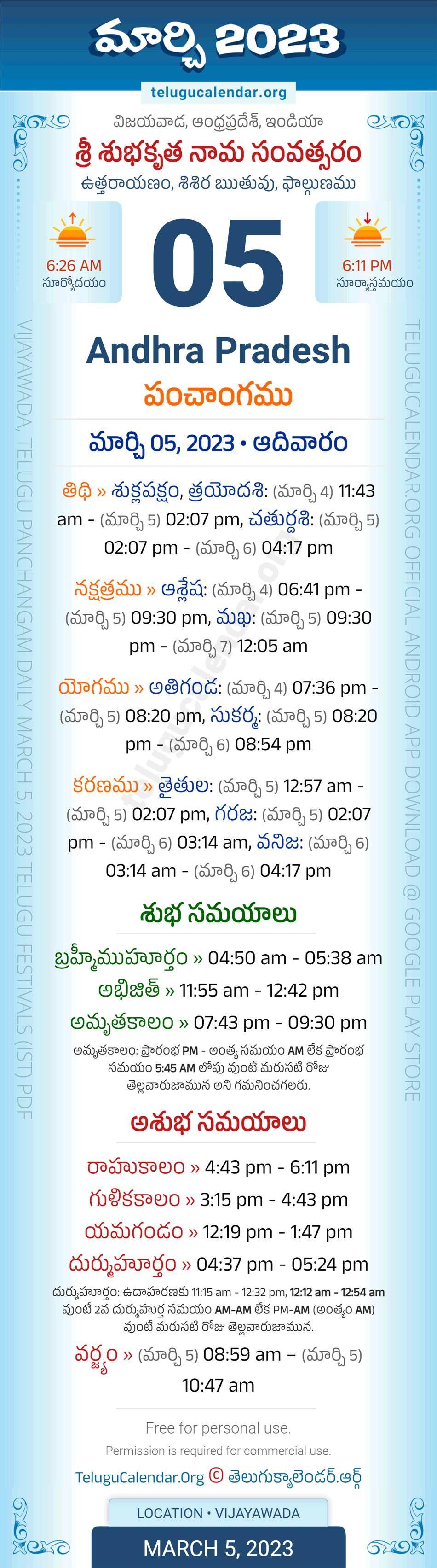 Download » March 5, 2023 » Andhra Pradesh (Vijayawada) Telugu Panchangam Daily Sheet with Auspicious and Inauspicious Timings.