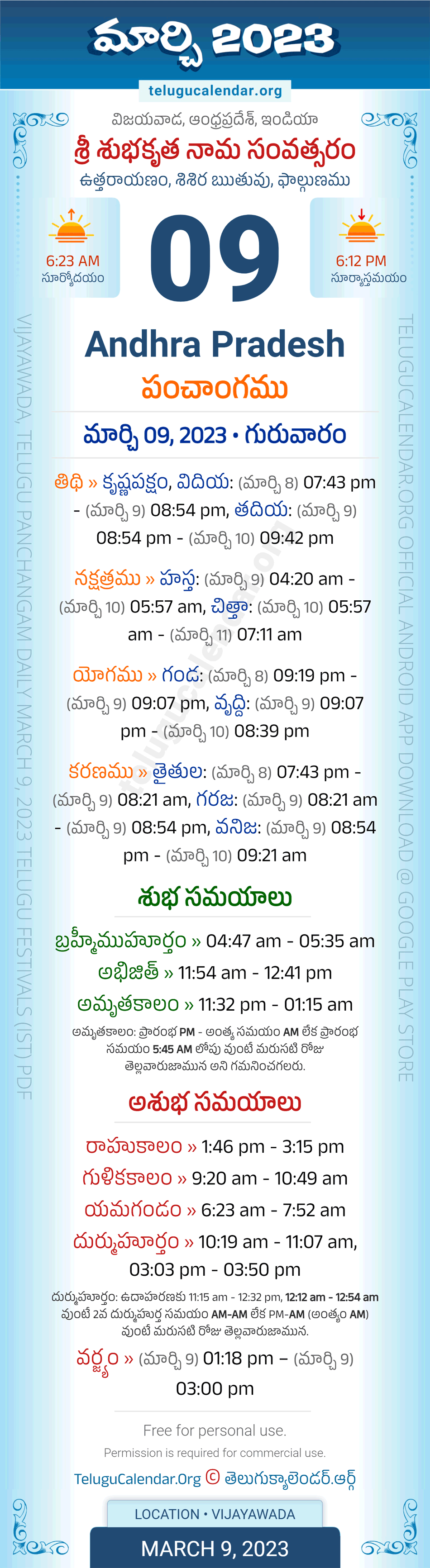 Download » March 9, 2023 » Andhra Pradesh (Vijayawada) Telugu Panchangam Daily Sheet with Auspicious and Inauspicious Timings.
