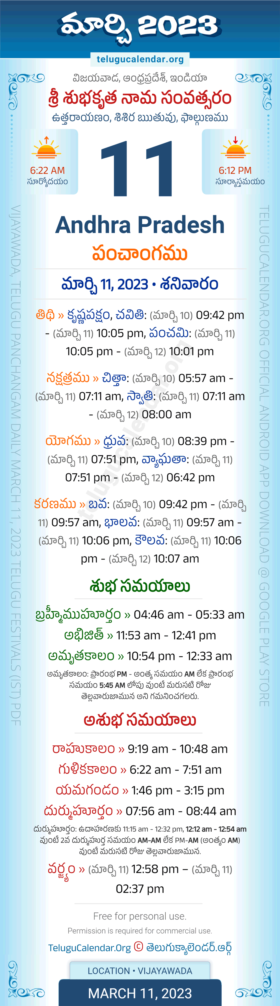 Download » March 11, 2023 » Andhra Pradesh (Vijayawada) Telugu Panchangam Daily Sheet with Auspicious and Inauspicious Timings.
