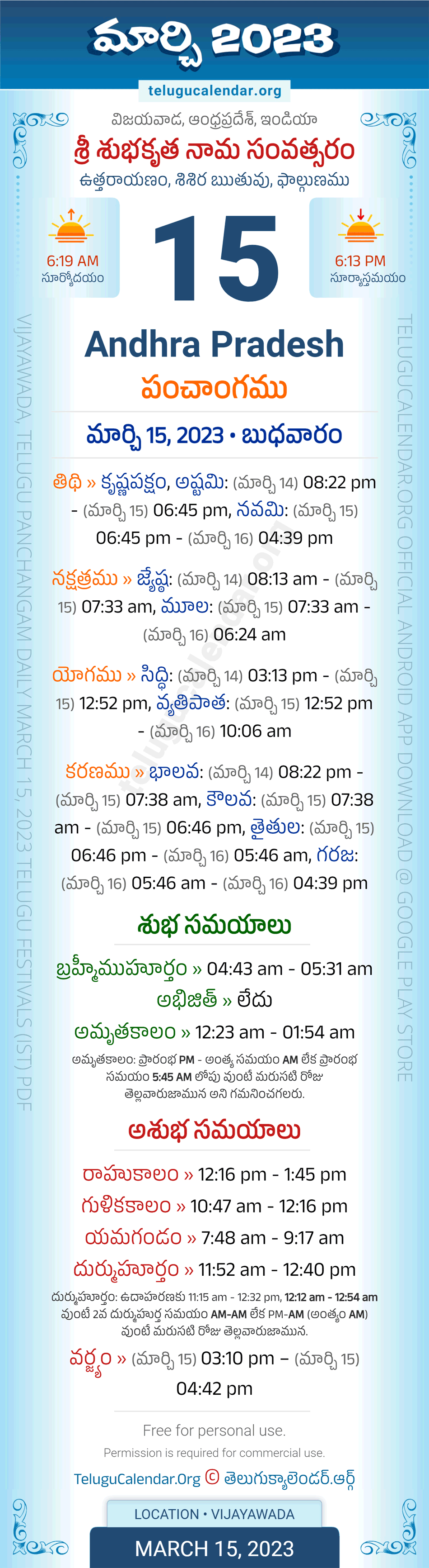 Apart from the Panchangam March 15, 2023 Andhra Pradesh Telugu Calendar Daily Sheet, you can also find the Sunrise and Sunset (Middle Limb) timings, Paksham, Telugu Year, Yanam, Rutuvu, Telugu Month. Today's Andhra Pradesh Auspicious Timings March 15, 2023 (Shubha Muhuratam Today Good Timings like Abhijit Muhurtham, Amruta Kalam & Brahma Muhurtham) and Today's Andhra Pradesh Inauspicious Timings March 15, 2023 (Bad Timings like Durmuhurtham, Rahukalam, Gulika kalam & Yamagandam) with starting and end timings in the above image.