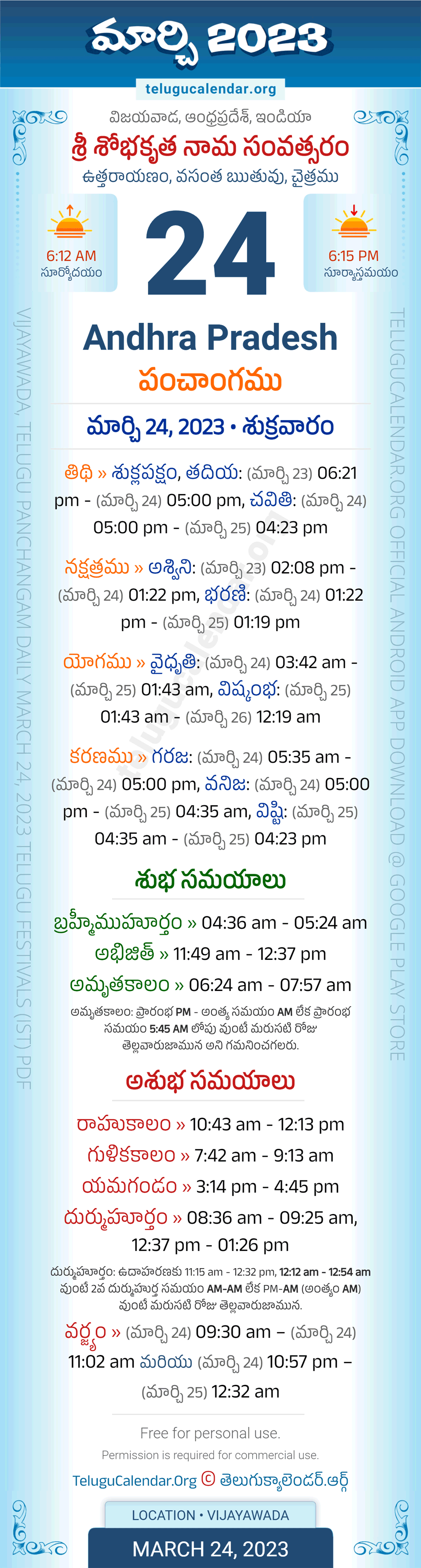 Apart from the Panchangam March 24, 2023 Andhra Pradesh Telugu Calendar Daily Sheet, you can also find the Sunrise and Sunset (Middle Limb) timings, Paksham, Telugu Year, Yanam, Rutuvu, Telugu Month. Today's Andhra Pradesh Auspicious Timings March 24, 2023 (Shubha Muhuratam Today Good Timings like Abhijit Muhurtham, Amruta Kalam & Brahma Muhurtham) and Today's Andhra Pradesh Inauspicious Timings March 24, 2023 (Bad Timings like Durmuhurtham, Rahukalam, Gulika kalam & Yamagandam) with starting and end timings in the above image.