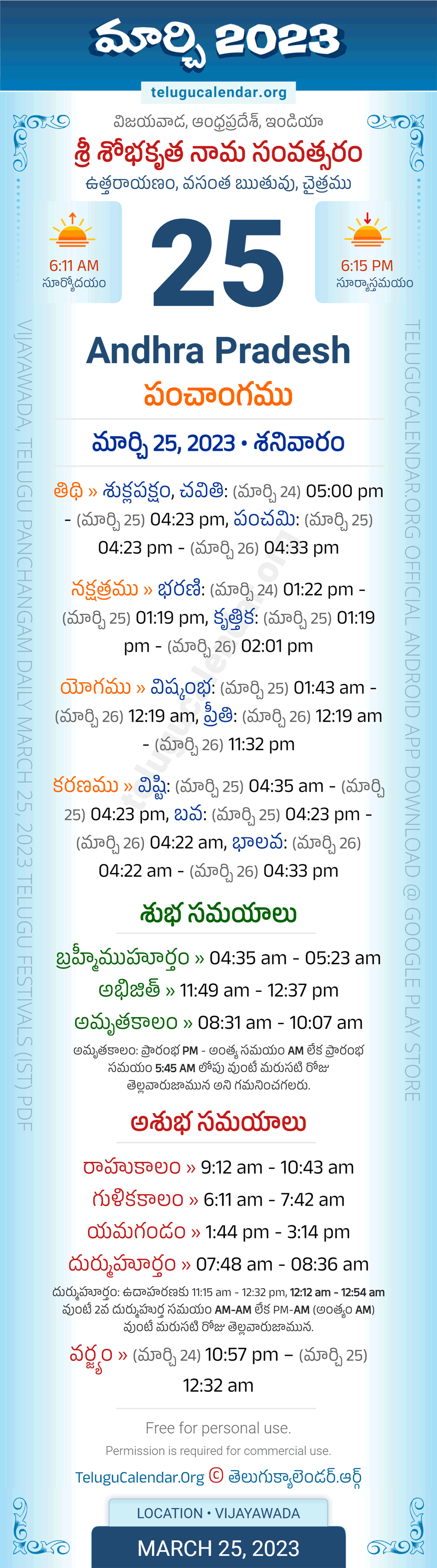 Apart from the Panchangam March 25, 2023 Andhra Pradesh Telugu Calendar Daily Sheet, you can also find the Sunrise and Sunset (Middle Limb) timings, Paksham, Telugu Year, Yanam, Rutuvu, Telugu Month. Today's Andhra Pradesh Auspicious Timings March 25, 2023 (Shubha Muhuratam Today Good Timings like Abhijit Muhurtham, Amruta Kalam & Brahma Muhurtham) and Today's Andhra Pradesh Inauspicious Timings March 25, 2023 (Bad Timings like Durmuhurtham, Rahukalam, Gulika kalam & Yamagandam) with starting and end timings in the above image.