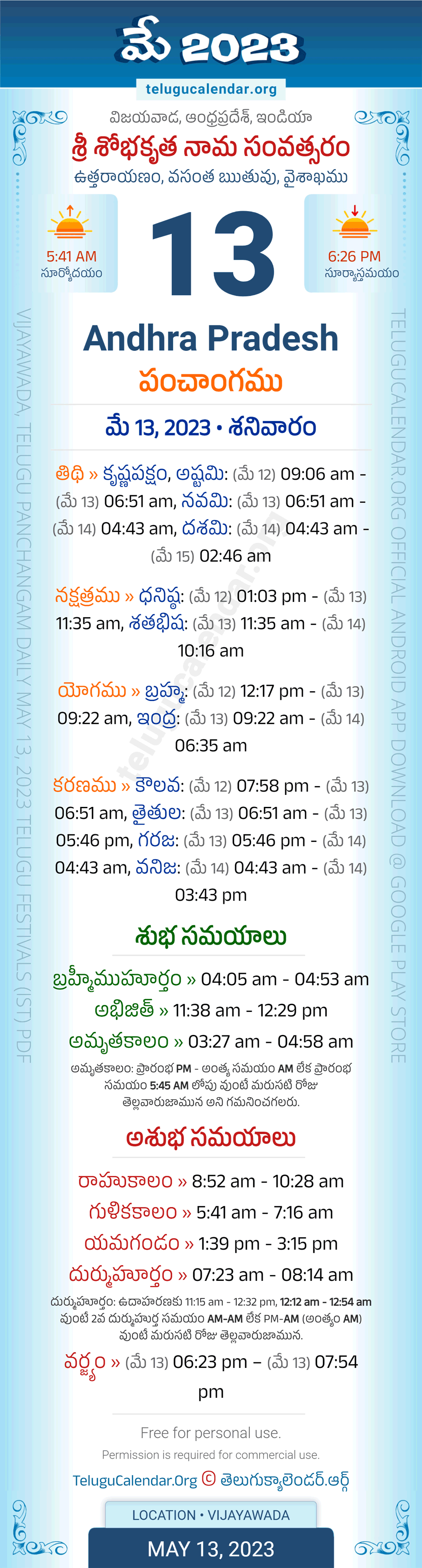 Download » May 13, 2023 » Andhra Pradesh (Vijayawada) Telugu Panchangam Daily Sheet with Auspicious and Inauspicious Timings.