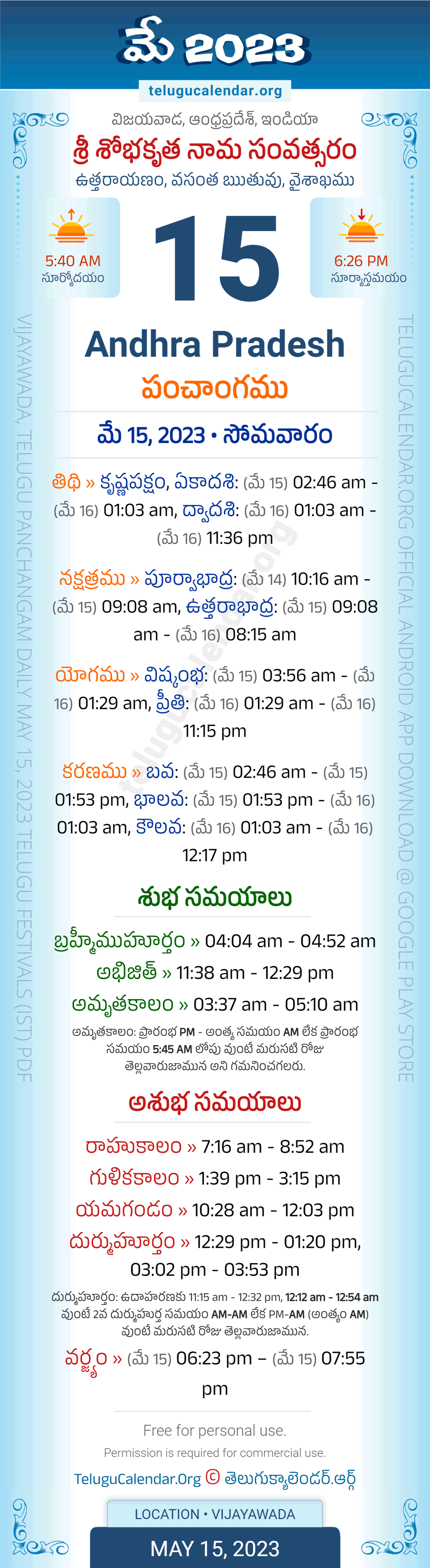 Download » May 15, 2023 » Andhra Pradesh (Vijayawada) Telugu Panchangam Daily Sheet with Auspicious and Inauspicious Timings.