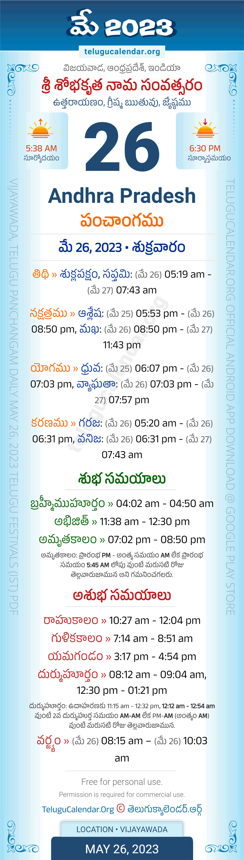Download » May 26, 2023 » Andhra Pradesh (Vijayawada) Telugu Panchangam Daily Sheet with Auspicious and Inauspicious Timings.