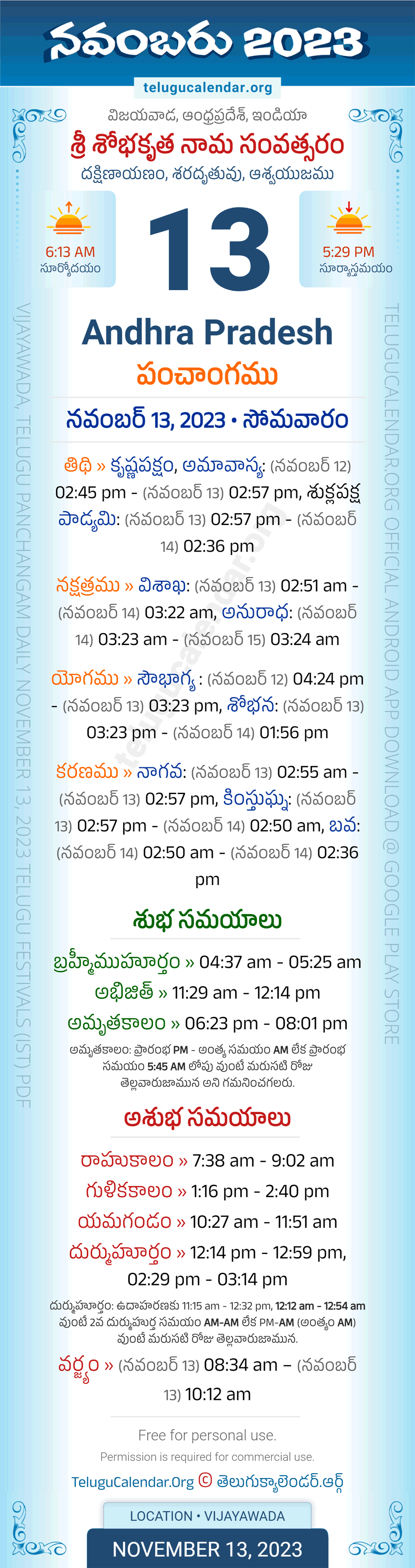 Download » November 13, 2023 » Andhra Pradesh (Vijayawada) Telugu Panchangam Daily Sheet with Auspicious and Inauspicious Timings.
