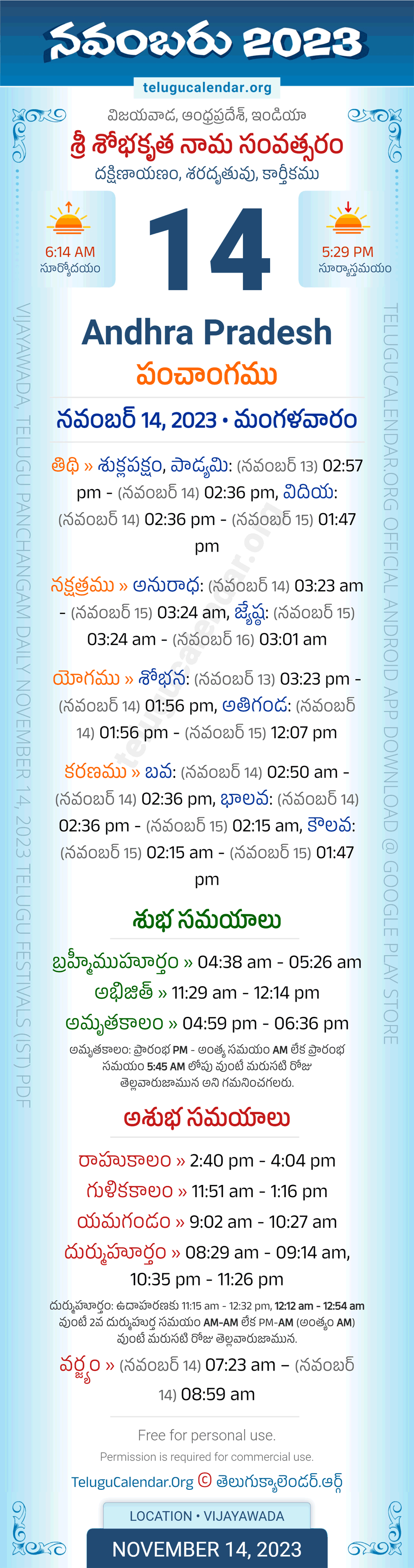 Andhra Pradesh Panchangam November 14, 2023 Daily Sheet in Telugu... Andhra Pradesh Telugu Panchangam Tuesday, November 14, 2023, Today's Andhra Pradesh Tithi: Sukla Paksham, Padyami: (Nov 13) 02:57 pm - (Nov 14) 02:36 pm, Vidiya: (Nov 14) 02:36 pm - (Nov 15) 01:47 pm, Today's Andhra Pradesh Nakshatram: Anuradha: (Nov 14) 03:23 am - (Nov 15) 03:24 am, Jyestha: (Nov 15) 03:24 am - (Nov 16) 03:01 am, Telugu Year: Sri Sobhakritu Nama Samvatsaram, Vedic Aayana: Dakshinayanam, Vedic Rutuvu: Sharad, Chandramasa (Amanta): Kartikamu. Below image showing information about the 5 attributes of the day, viz., Varam, Tithi, Nakshatram, Yogam & Karanam along with starting and end timings. Read more