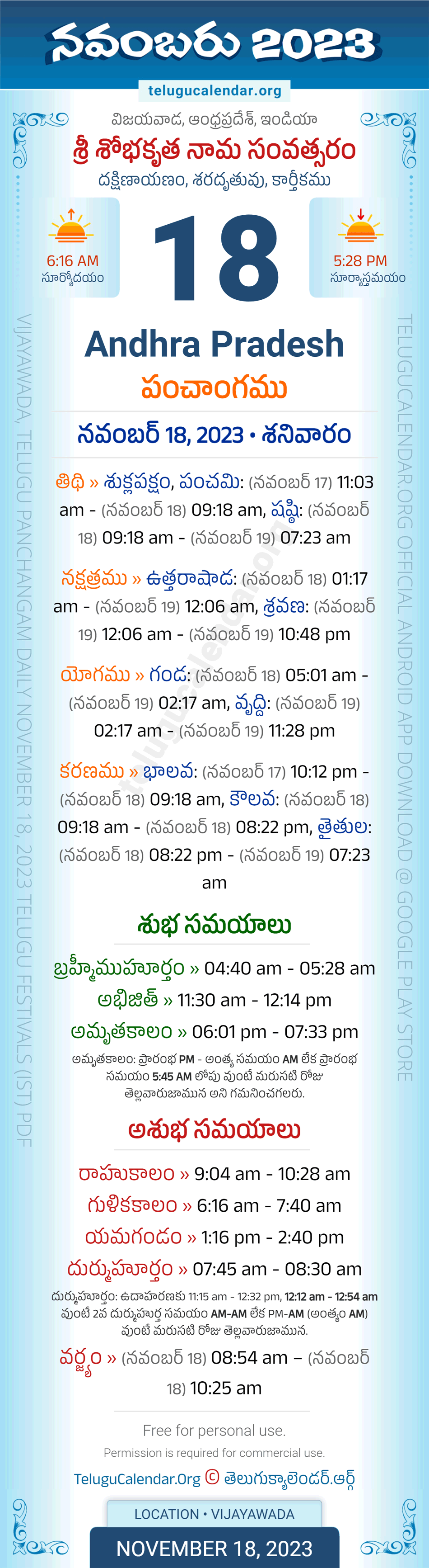Download » November 18, 2023 » Andhra Pradesh (Vijayawada) Telugu Panchangam Daily Sheet with Auspicious and Inauspicious Timings.