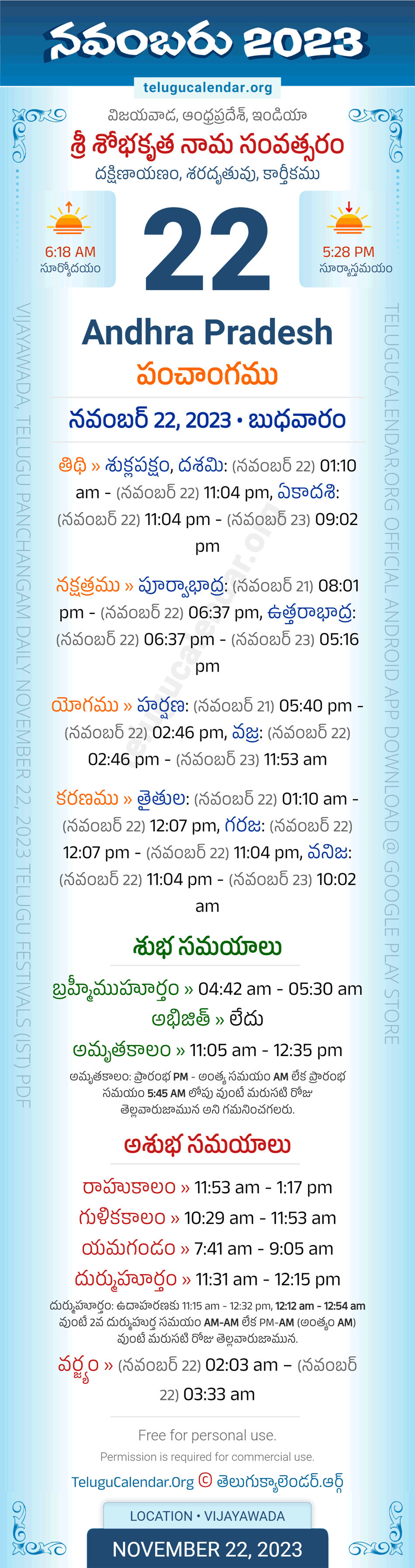 Andhra Pradesh Panchangam November 22, 2023 Daily Sheet in Telugu... Andhra Pradesh Telugu Panchangam Wednesday, November 22, 2023, Today's Andhra Pradesh Tithi: Sukla Paksham, Dashami: (Nov 22) 01:10 am - (Nov 22) 11:04 pm, Ekadashi: (Nov 22) 11:04 pm - (Nov 23) 09:02 pm, Today's Andhra Pradesh Nakshatram: Purva Bhadrapada: (Nov 21) 08:01 pm - (Nov 22) 06:37 pm, Uttara Bhadrapada: (Nov 22) 06:37 pm - (Nov 23) 05:16 pm, Telugu Year: Sri Sobhakritu Nama Samvatsaram, Vedic Aayana: Dakshinayanam, Vedic Rutuvu: Sharad, Chandramasa (Amanta): Kartikamu. Below image showing information about the 5 attributes of the day, viz., Varam, Tithi, Nakshatram, Yogam & Karanam along with starting and end timings. Read more