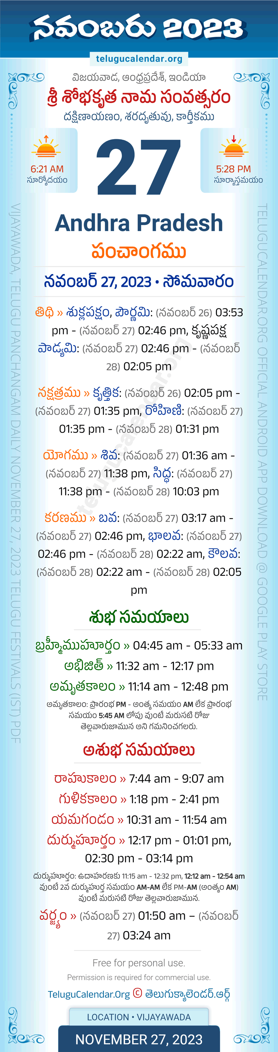 Andhra Pradesh Panchangam November 27, 2023 Daily Sheet in Telugu... Andhra Pradesh Telugu Panchangam Monday, November 27, 2023, Today's Andhra Pradesh Tithi: Sukla Paksham, Pournami: (Nov 26) 03:53 pm - (Nov 27) 02:46 pm, Krishna Paksha Padyami: (Nov 27) 02:46 pm - (Nov 28) 02:05 pm, Today's Andhra Pradesh Nakshatram: Krithika: (Nov 26) 02:05 pm - (Nov 27) 01:35 pm, Krithika: (Nov 27) 01:35 pm - (Nov 28) 01:31 pm, Telugu Year: Sri Sobhakritu Nama Samvatsaram, Vedic Aayana: Dakshinayanam, Vedic Rutuvu: Sharad, Chandramasa (Amanta): Kartikamu. Below image showing information about the 5 attributes of the day, viz., Varam, Tithi, Nakshatram, Yogam & Karanam along with starting and end timings. Read more