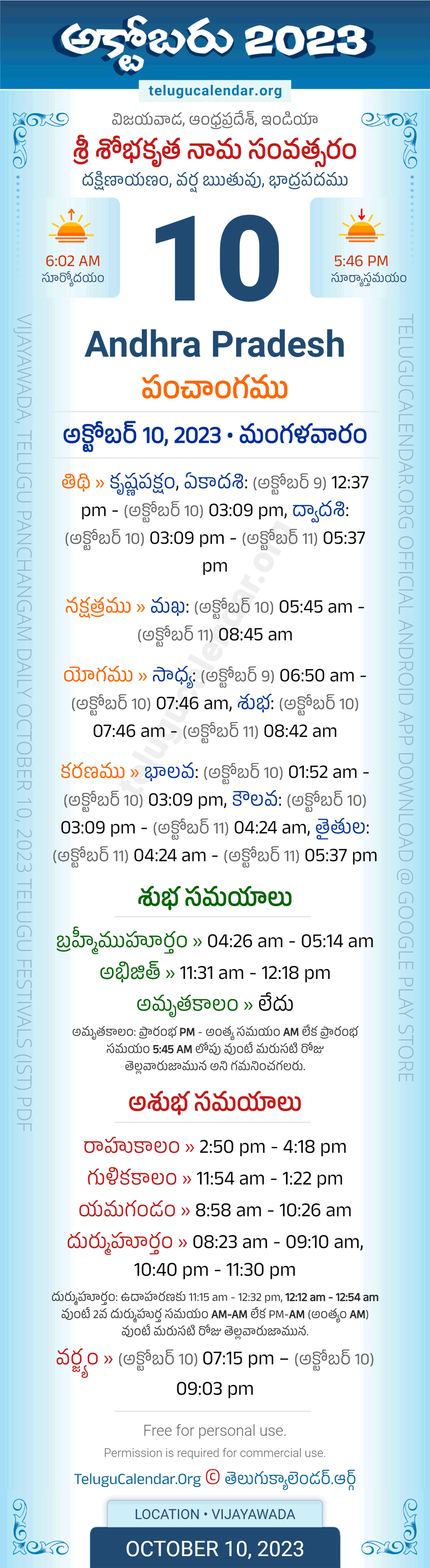 Download » October 10, 2023 » Andhra Pradesh (Vijayawada) Telugu Panchangam Daily Sheet with Auspicious and Inauspicious Timings.