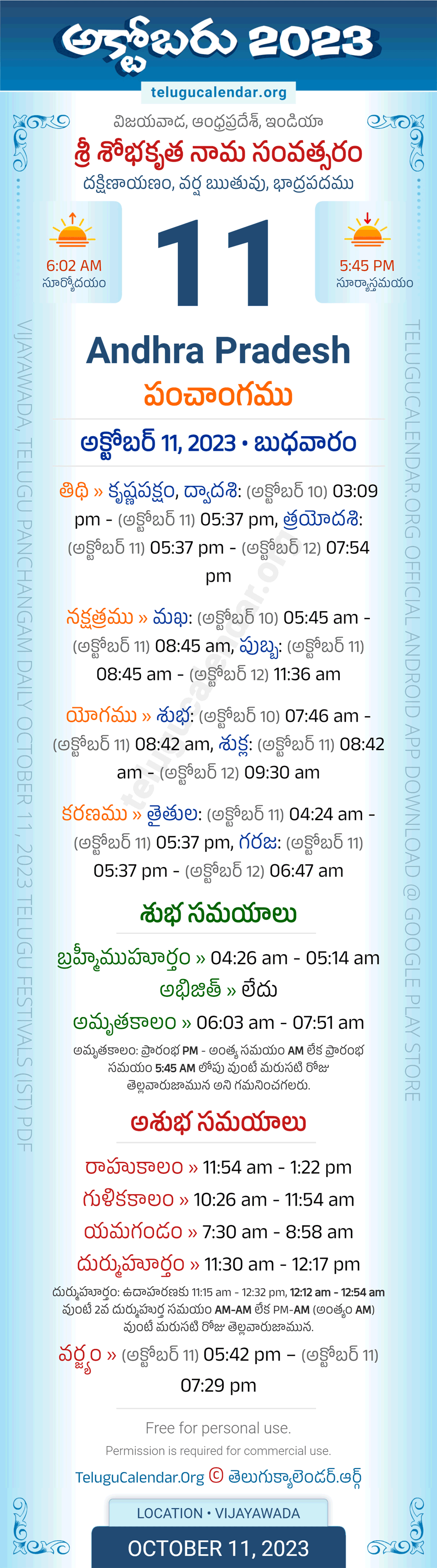 Download » October 11, 2023 » Andhra Pradesh (Vijayawada) Telugu Panchangam Daily Sheet with Auspicious and Inauspicious Timings.