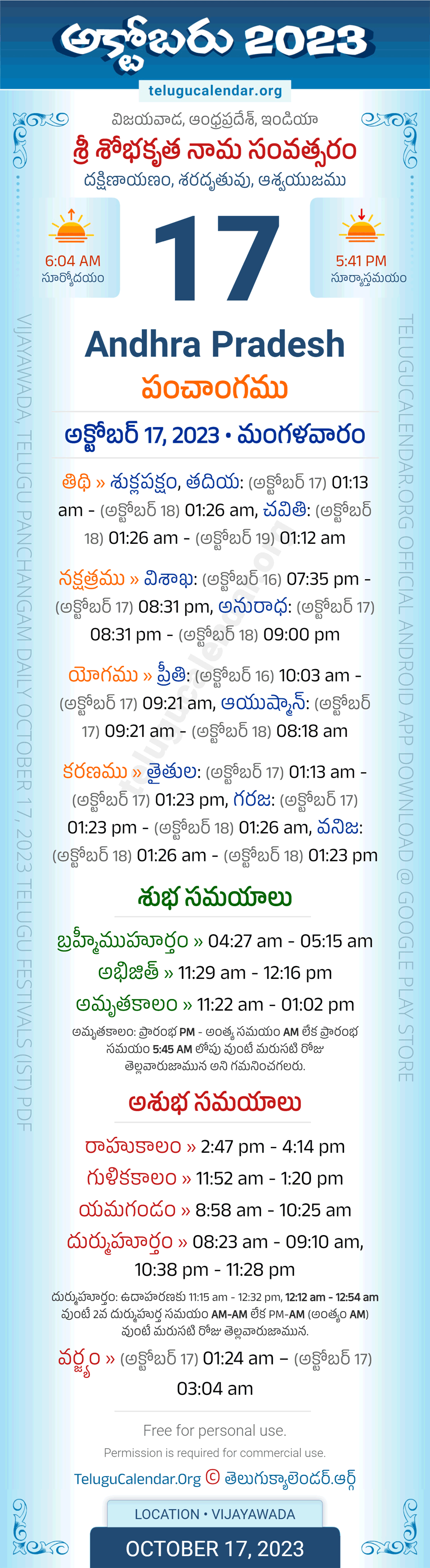 Download » October 17, 2023 » Andhra Pradesh (Vijayawada) Telugu Panchangam Daily Sheet with Auspicious and Inauspicious Timings.