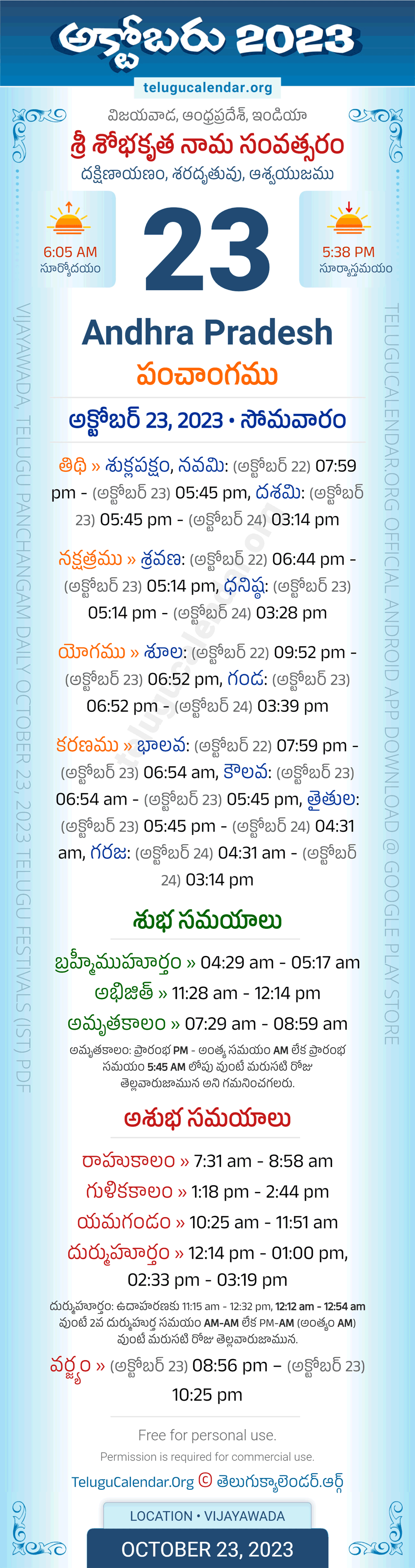 Download » October 23, 2023 » Andhra Pradesh (Vijayawada) Telugu Panchangam Daily Sheet with Auspicious and Inauspicious Timings.