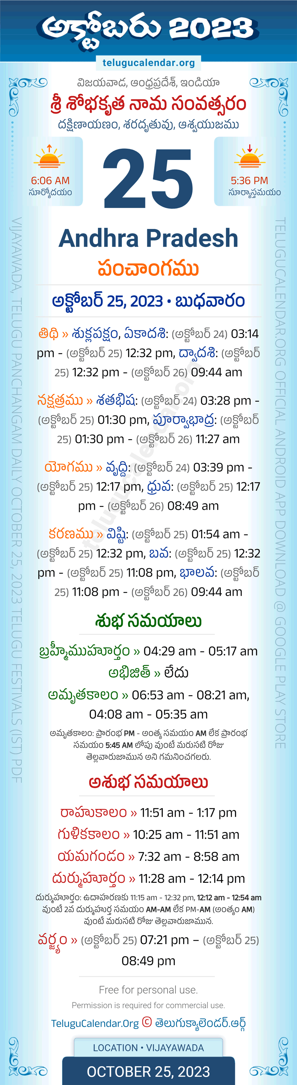 Download » October 25, 2023 » Andhra Pradesh (Vijayawada) Telugu Panchangam Daily Sheet with Auspicious and Inauspicious Timings.
