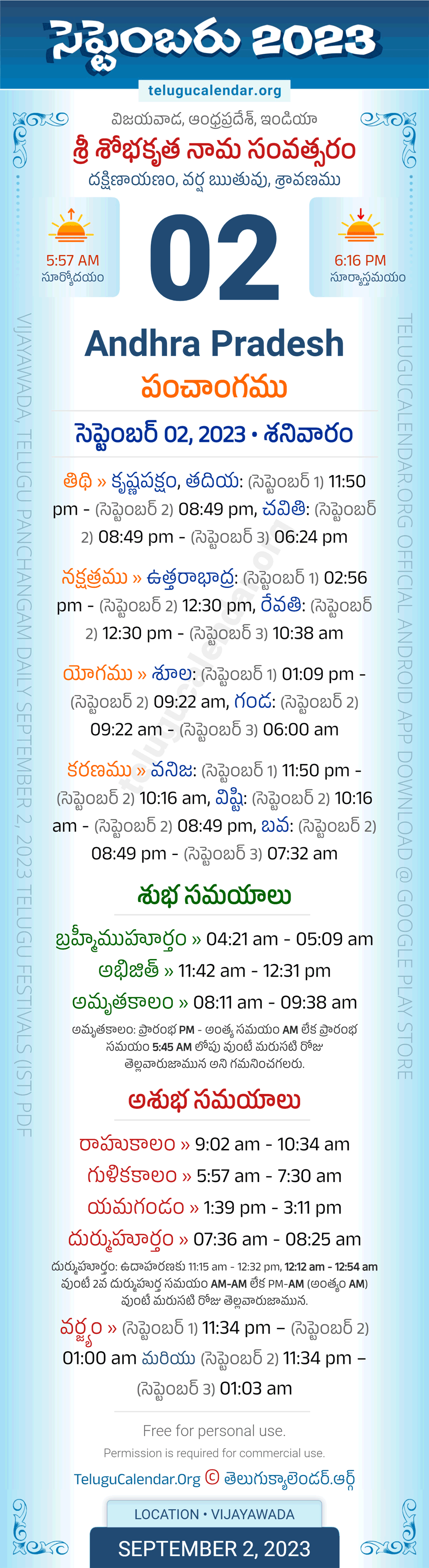 Download » September 2, 2023 » Andhra Pradesh (Vijayawada) Telugu Panchangam Daily Sheet with Auspicious and Inauspicious Timings.