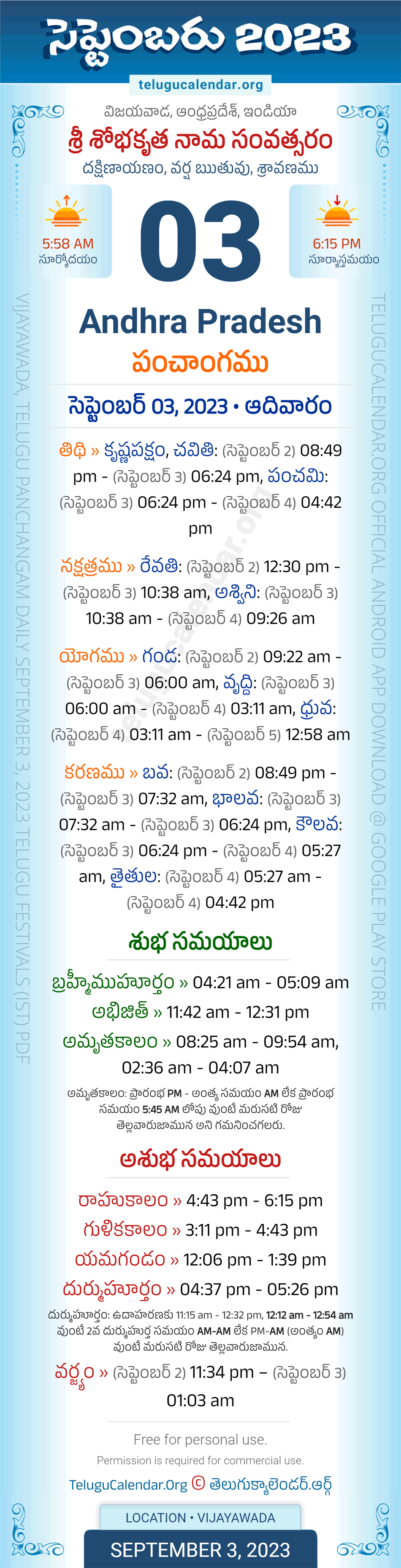 Download » September 3, 2023 » Andhra Pradesh (Vijayawada) Telugu Panchangam Daily Sheet with Auspicious and Inauspicious Timings.