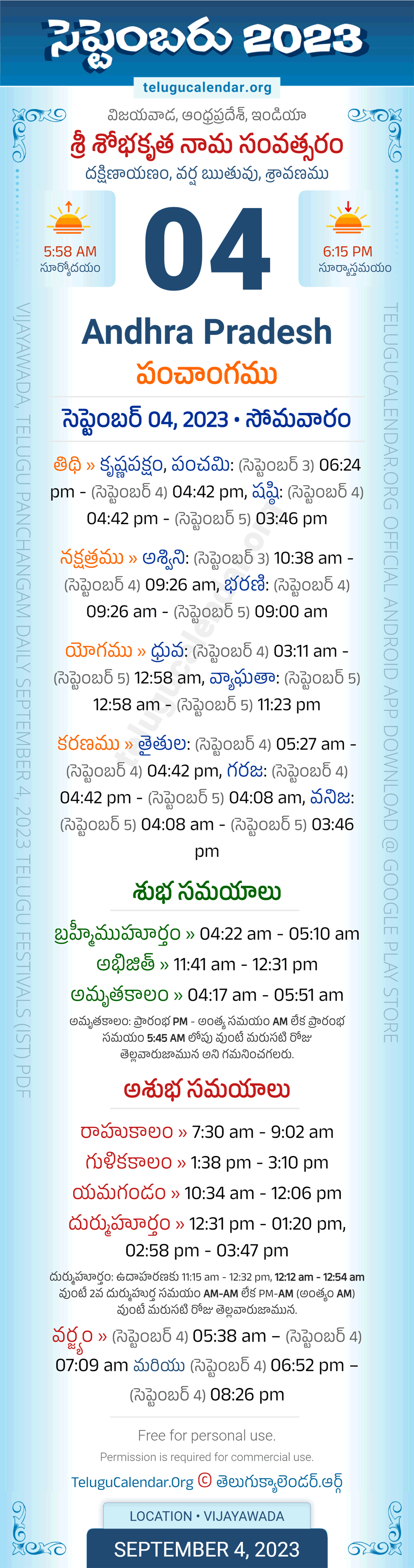 Download » September 4, 2023 » Andhra Pradesh (Vijayawada) Telugu Panchangam Daily Sheet with Auspicious and Inauspicious Timings.