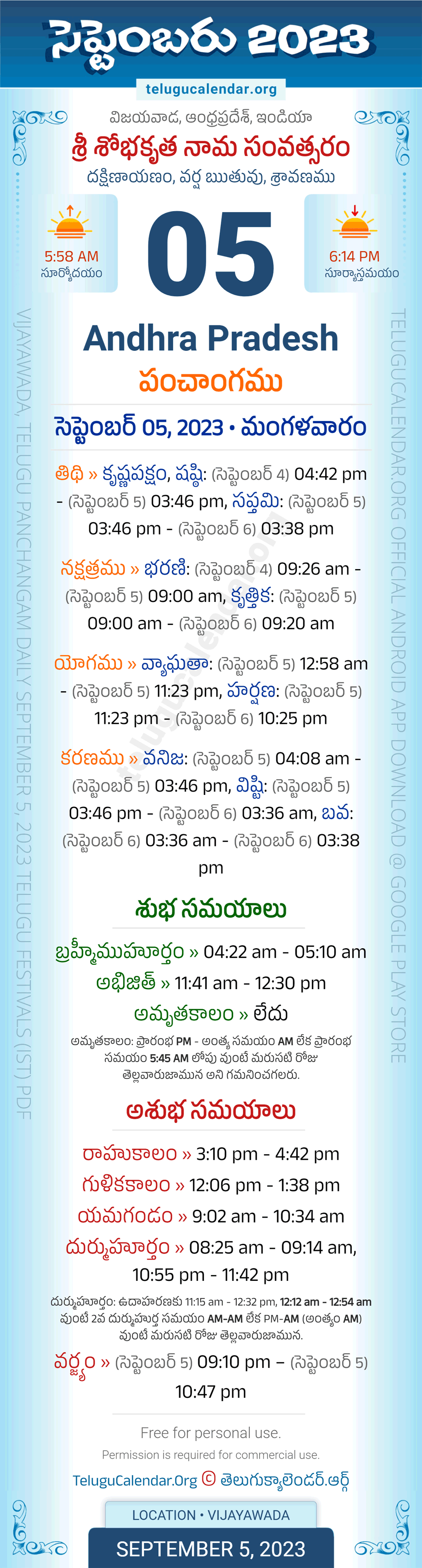 Andhra Pradesh Panchangam September 5, 2023 Daily Sheet in Telugu... Andhra Pradesh Telugu Panchangam Tuesday, September 05, 2023, Today's Andhra Pradesh Tithi: Krishna Paksham, Shashthi: (Sep 4) 04:42 pm - (Sep 5) 03:46 pm, Saptami: (Sep 5) 03:46 pm - (Sep 6) 03:38 pm, Today's Andhra Pradesh Nakshatram: Bharani: (Sep 4) 09:26 am - (Sep 5) 09:00 am, Krithika: (Sep 5) 09:00 am - (Sep 6) 09:20 am, Telugu Year: Sri Sobhakritu Nama Samvatsaram, Vedic Aayana: Dakshinayanam, Vedic Rutuvu: Varsha, Chandramasa (Amanta): Sravanamu. Below image showing information about the 5 attributes of the day, viz., Varam, Tithi, Nakshatram, Yogam & Karanam along with starting and end timings. Read more