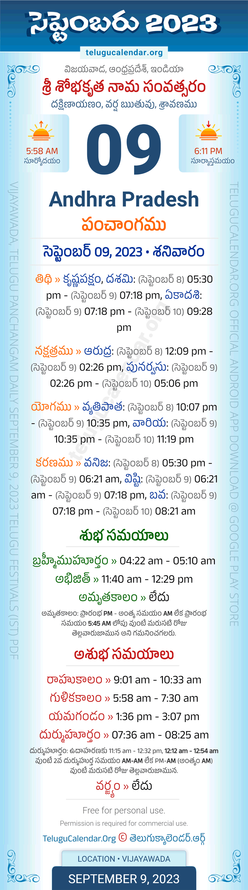 Download » September 9, 2023 » Andhra Pradesh (Vijayawada) Telugu Panchangam Daily Sheet with Auspicious and Inauspicious Timings.