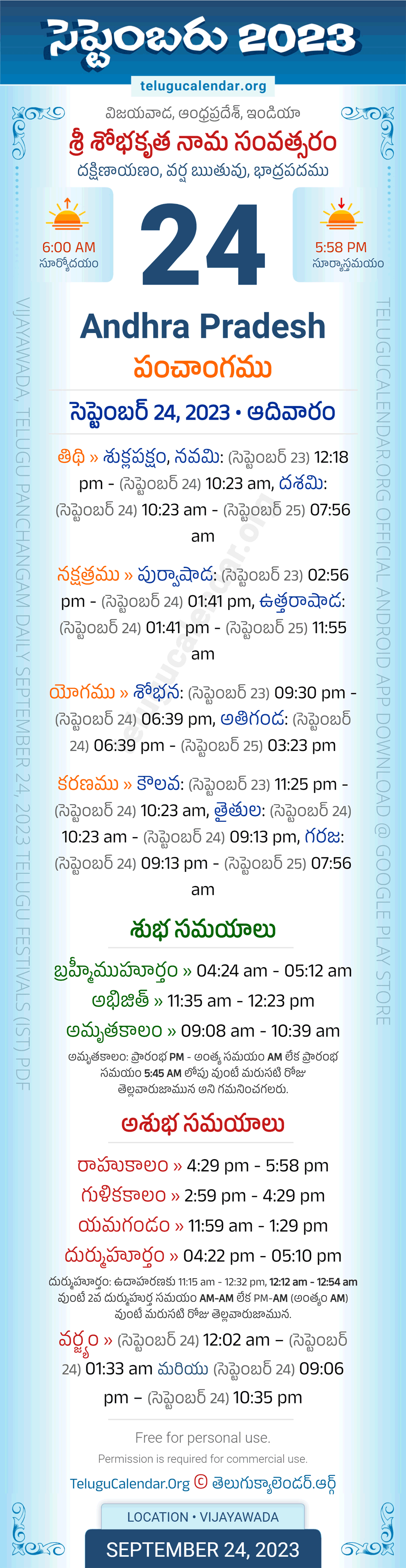 Download » September 24, 2023 » Andhra Pradesh (Vijayawada) Telugu Panchangam Daily Sheet with Auspicious and Inauspicious Timings.