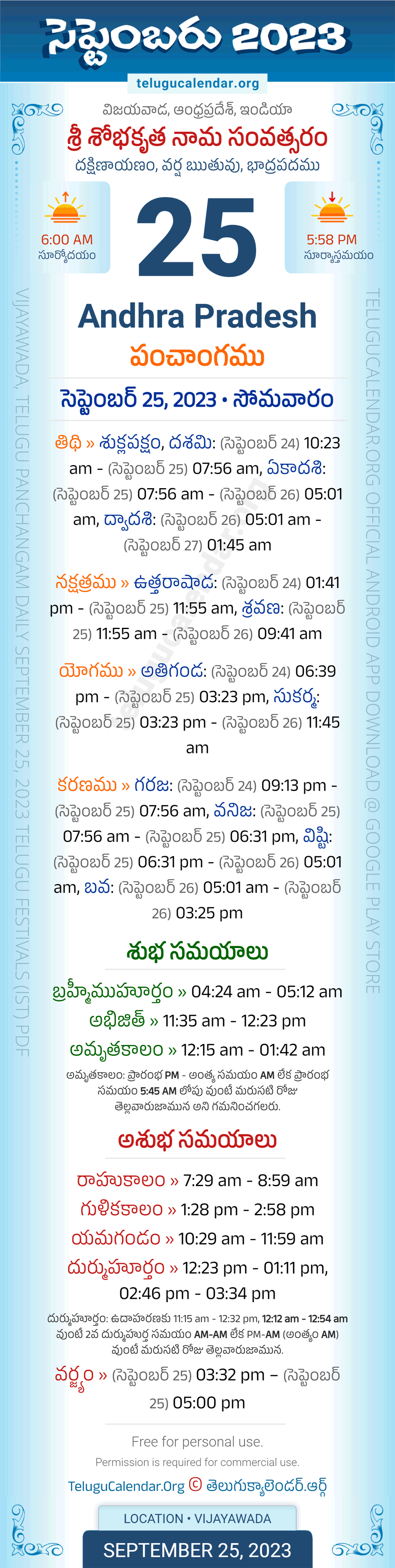 Download » September 25, 2023 » Andhra Pradesh (Vijayawada) Telugu Panchangam Daily Sheet with Auspicious and Inauspicious Timings.