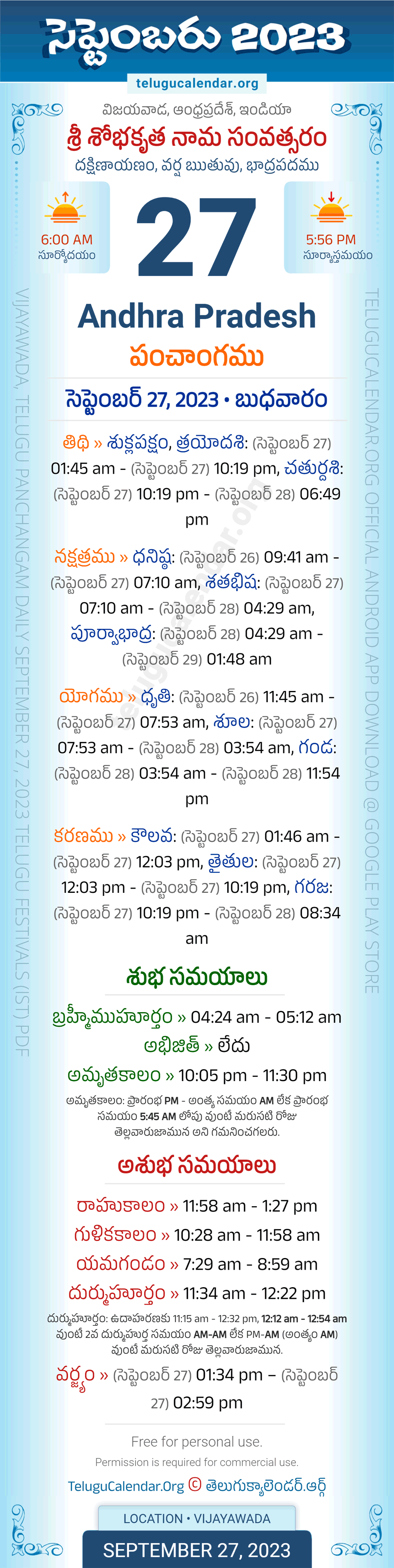 Download » September 27, 2023 » Andhra Pradesh (Vijayawada) Telugu Panchangam Daily Sheet with Auspicious and Inauspicious Timings.