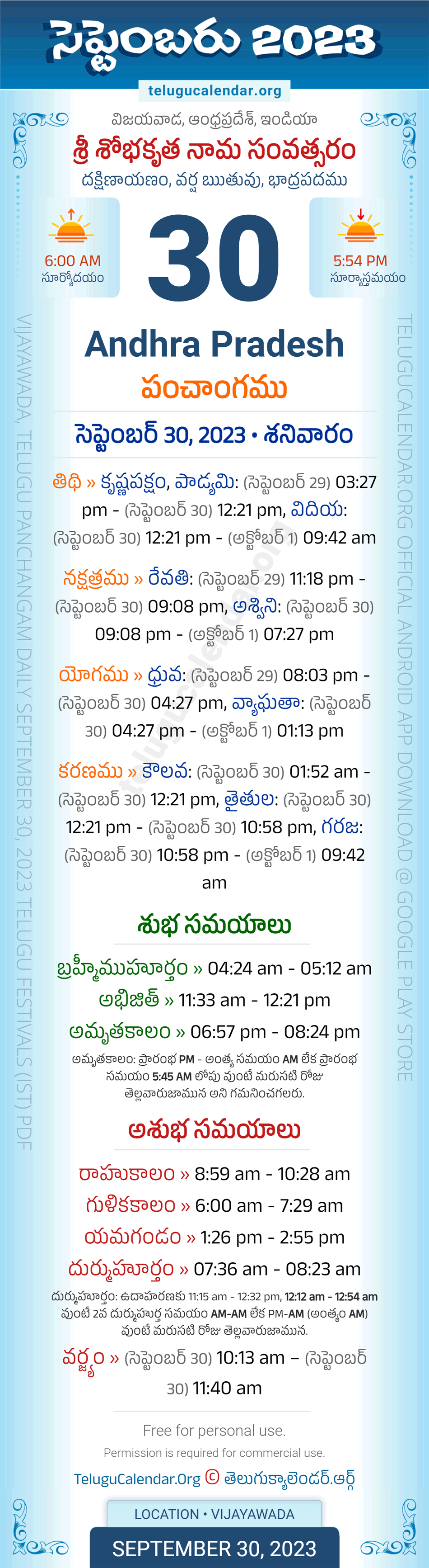 Download » September 30, 2023 » Andhra Pradesh (Vijayawada) Telugu Panchangam Daily Sheet with Auspicious and Inauspicious Timings.