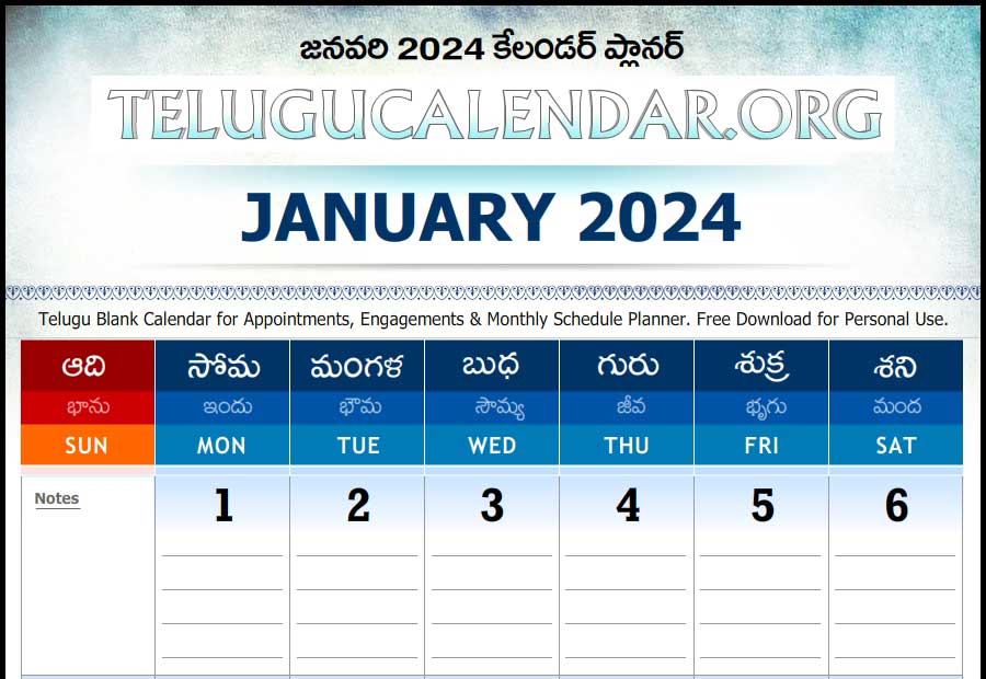 2024 Telugu Calendar Planner January Blank Schedule Planner.