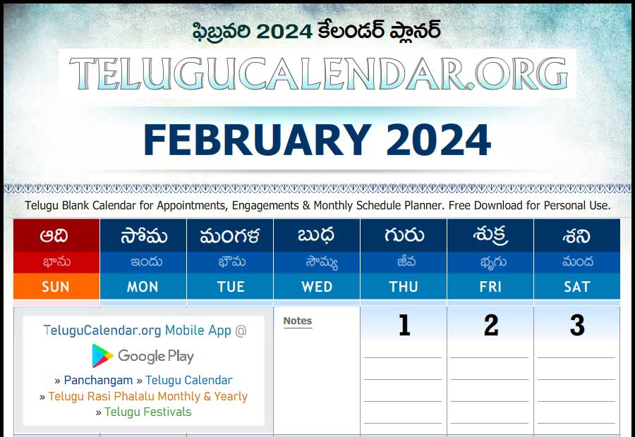 2024 Telugu Calendar Planner February Blank Schedule Planner.