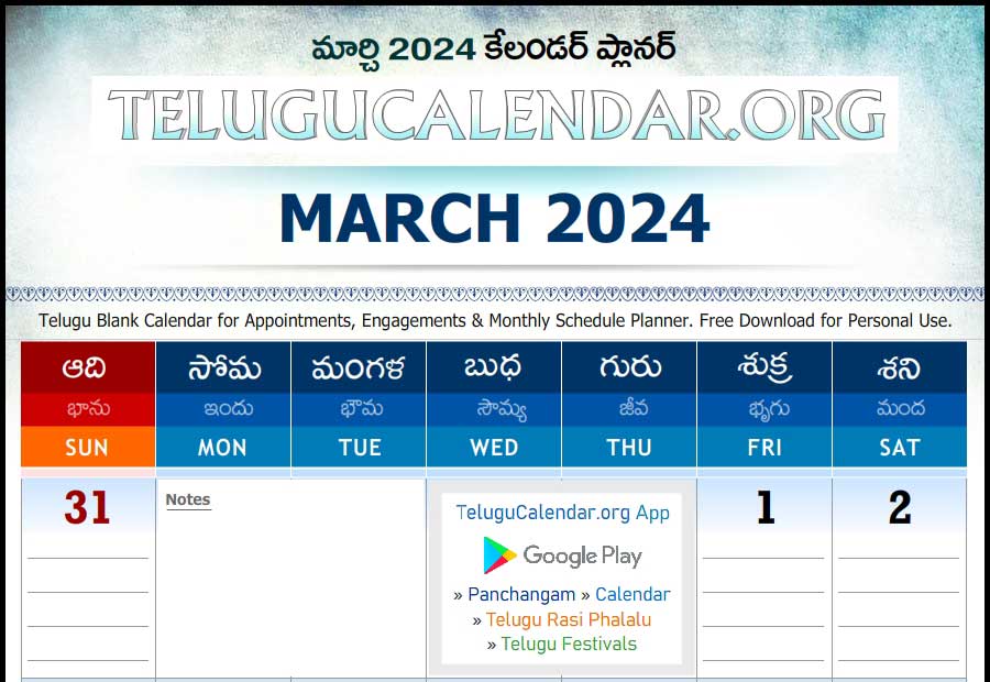2024 Telugu Calendar Planner March Blank Schedule Planner.