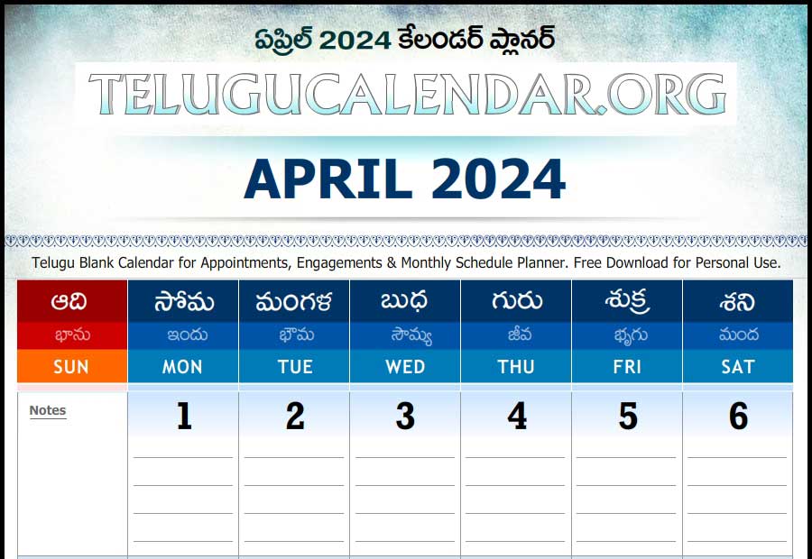 2024 Telugu Calendar Planner April Blank Schedule Planner.