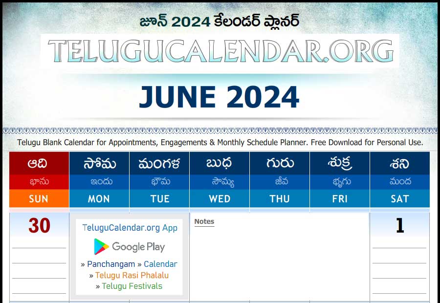 2024 Telugu Calendar Planner June Blank Schedule Planner.