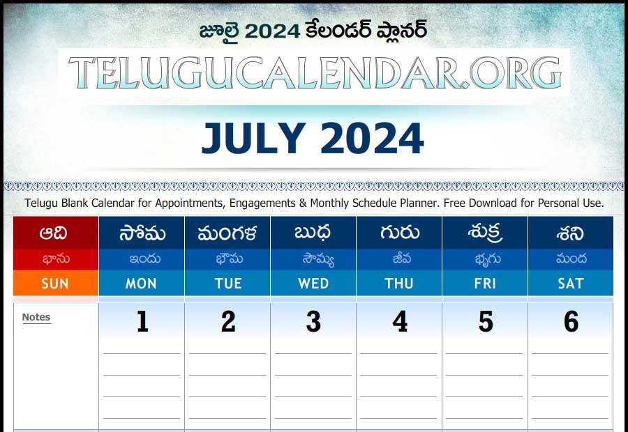2024 Telugu Calendar Planner July Blank Schedule Planner.