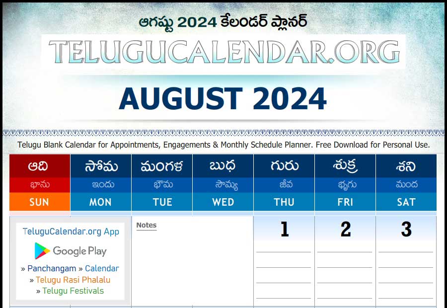 2024 Telugu Calendar Planner August Blank Schedule Planner.