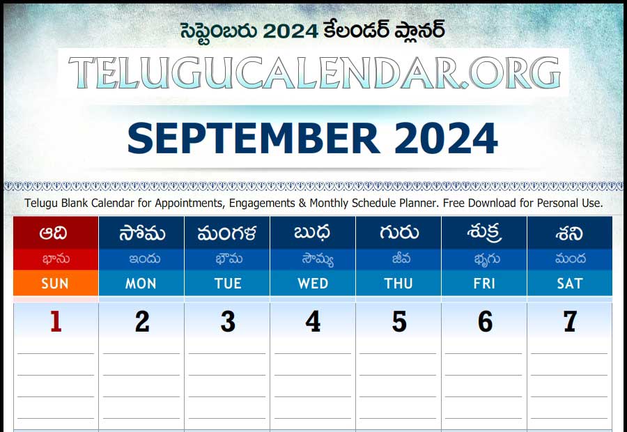 2024 Telugu Calendar Planner September Blank Schedule Planner.